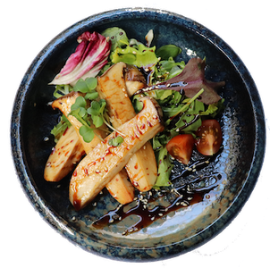 Kräuterseitlinge vom Grill, Schnitlauch, Sesam, Teriyaki Sauce